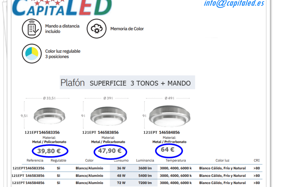 Plafón Superficie 3 Tonos + Mando