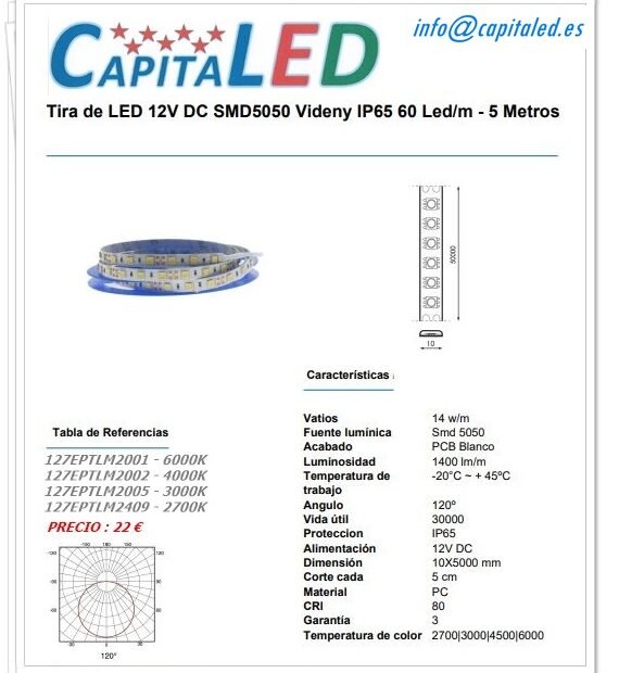 Tira Led 14W 12v IP65 3-4-6000K 9