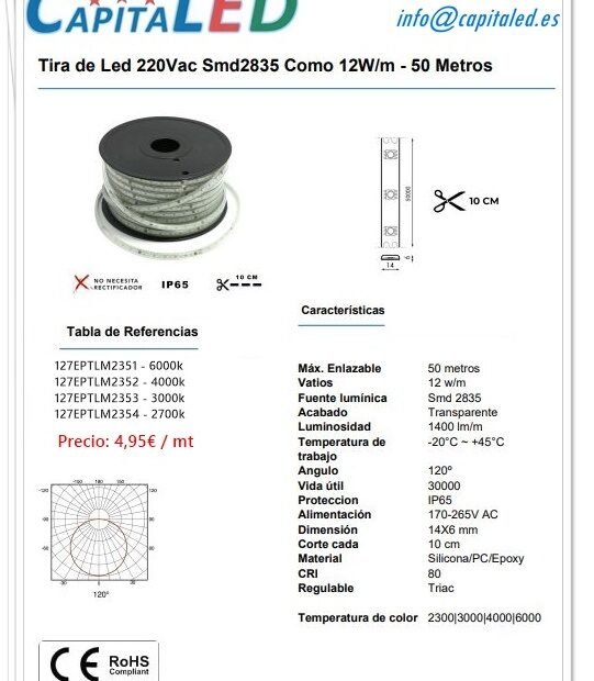 Tira Led 220V SMD 2835 Como 12W/m – 50 m