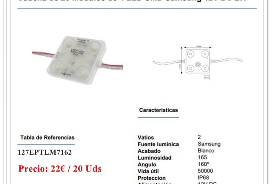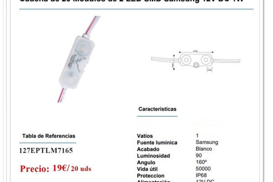 Cadena de 20 Módulos de 1 Led SMD Samsung 12V DC 2W